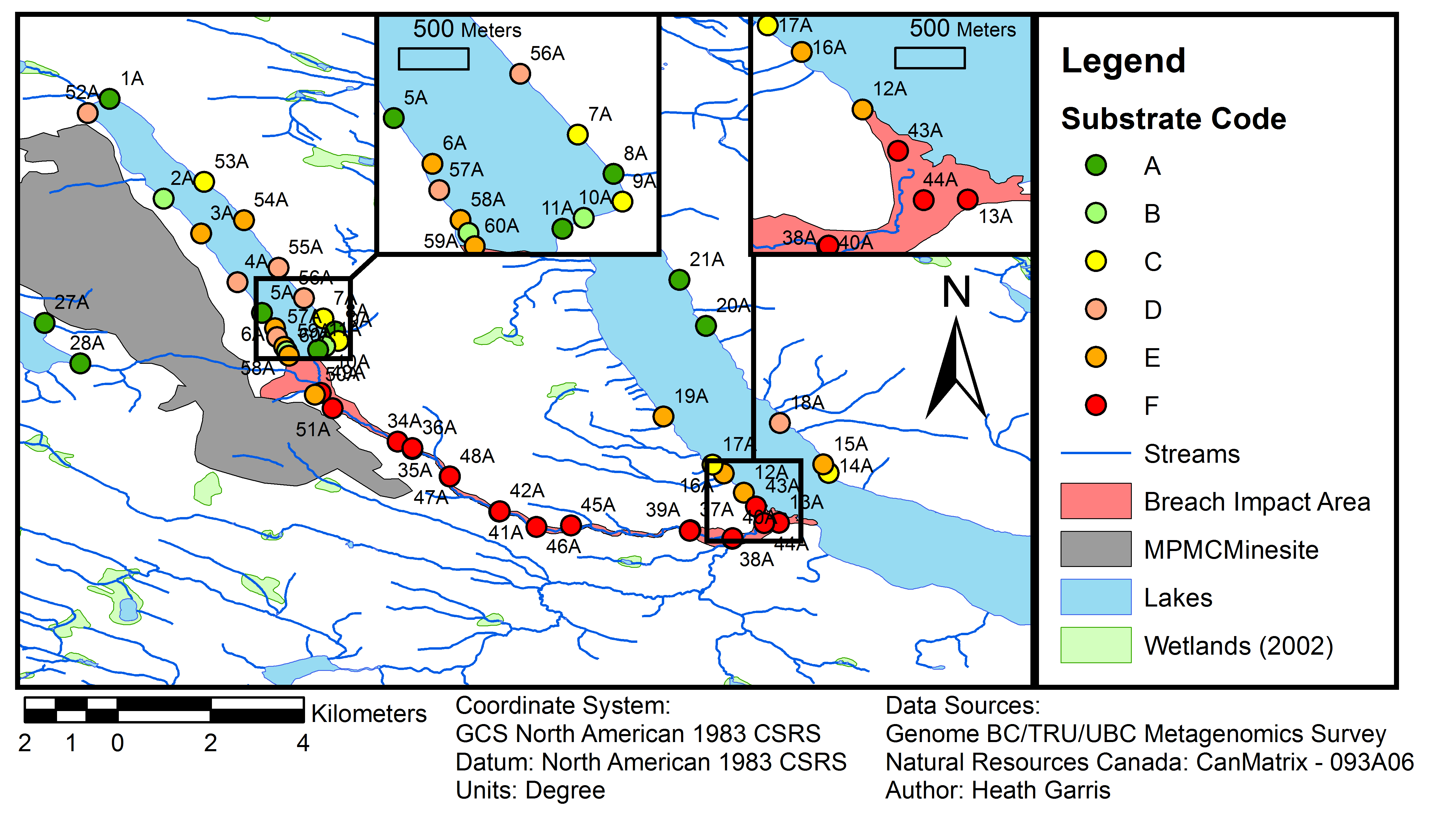 Through the support of an NSERC Accelerate Fellowship, I began working on a partnership between the University of British Columbia, Thompson Rivers University, and Mount Polley Mine to investigate the role soil microbial communities play in determining plant community composition and structure. This project started in July 2014, and largely altered in scope following the collapse of the Mine’s tailings impoundment, releasing 24 million m2 of untreated mine waste into the local watershed. After securing funding for sequencing and fieldwork through Genome Canada and Genome BC, my collaborators and I used our shared technical strengths to develop a biomonitoring program for passive remediation of the site, and coordinated research outcomes alongside the reclamation effort. This ‘natural experiment’ provided a unique opportunity to evaluate the role of both disturbance and microbial community composition and structure in determining soil metabolic processes within a rapidly changing landscape (Garris et al 2018).